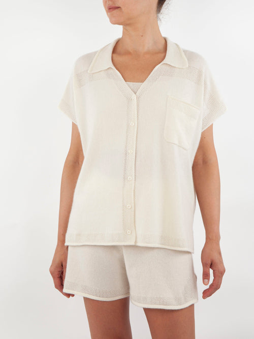 A delicate lace stitched pyjama shirt crafted by skilled artisans from the softest premium cashmere with mini corozo button detailing.